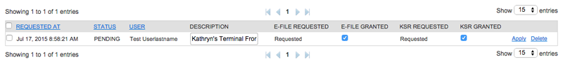 2. Check the E-File Granted and the KSR Granted checkboxes, then click Apply.