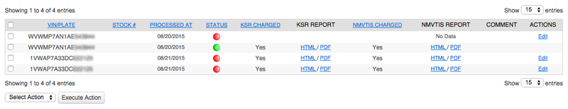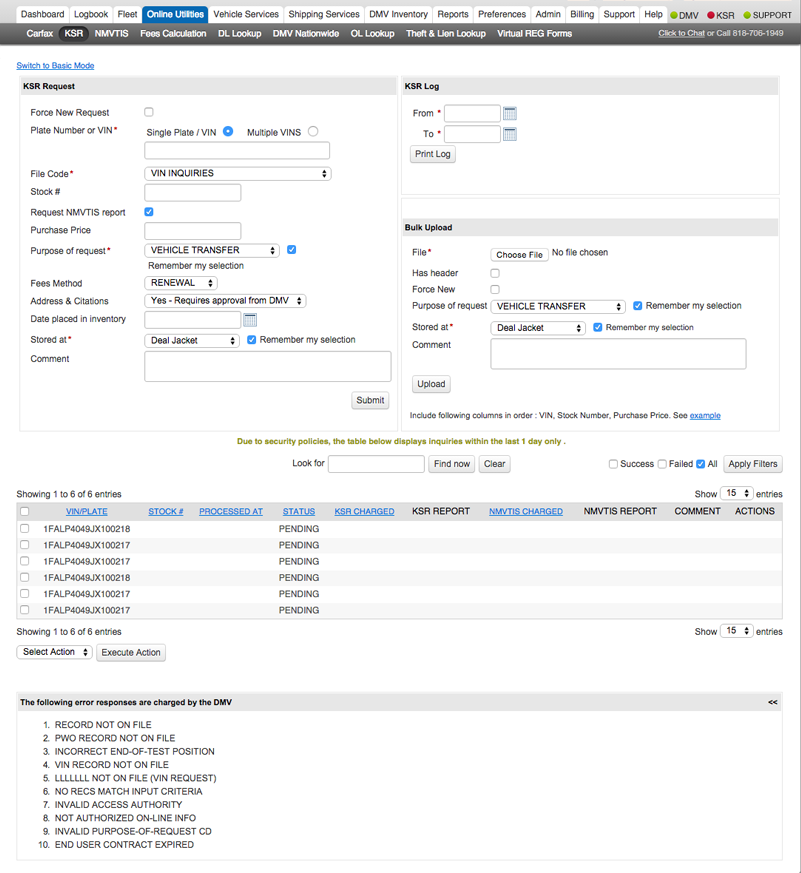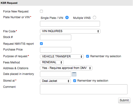 Note: DMVdesk stores the KSR information for approximately 60 days to avoid multiple charges when requesting information on the same vehicle within the dealership. This is especially helpful for DMVdesk clerks who are able to populate much of the eFile data for the vehicle from the pre-run KSR.